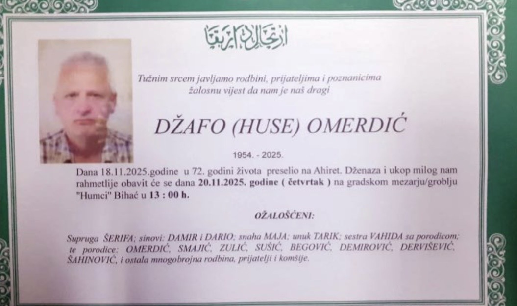 Dženaza i ukop milog nam rahmetlije obavit će se dana 20.11.2025. godine (četvrtak) na gradskom mezarju/groblju “Humci” Bihać u 13:00 h.