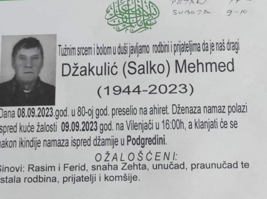Dženaza namaz polazi ispred kuće žalosti 09.09.2023 god. na Vilenjači u 16:00h.