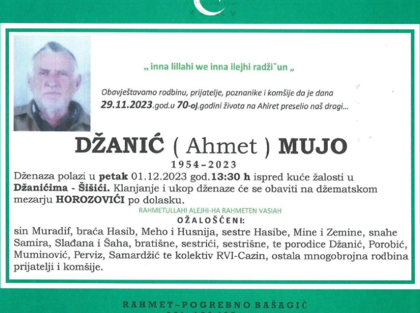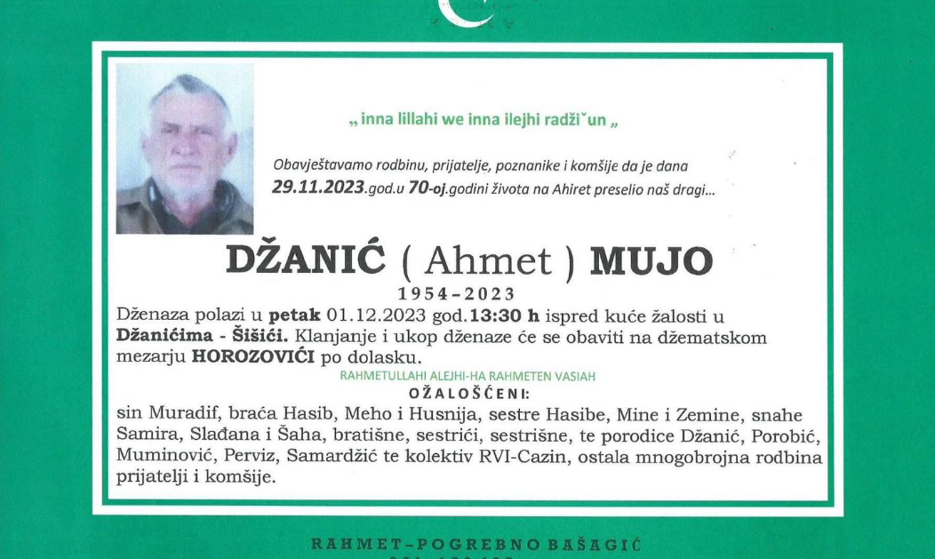 Obavještavamo rodbinu, prijatelje, poznanike i komšije da je dana 29.11.2023.god.u 70-oj.godini života na Ahiret preselio naš dragi DŽANIĆ (Ahmet) MUJO.