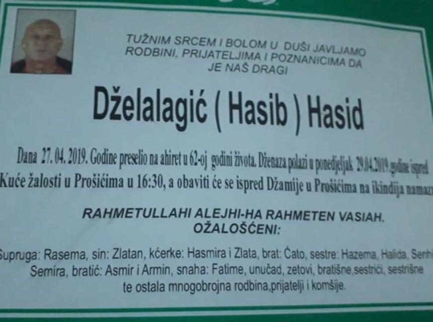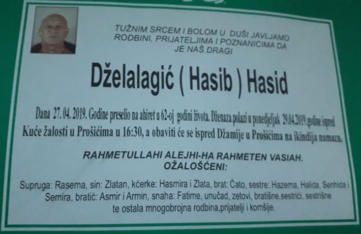 Tužnim srcem i bolom u duši javljamo rodbini, prijateljima i komšijama žalosnu vijest da je 27.04.2019. u 62.-oj godini na Ahiret preselio naš dragi Dželalagić (Hasib) Hasid.
