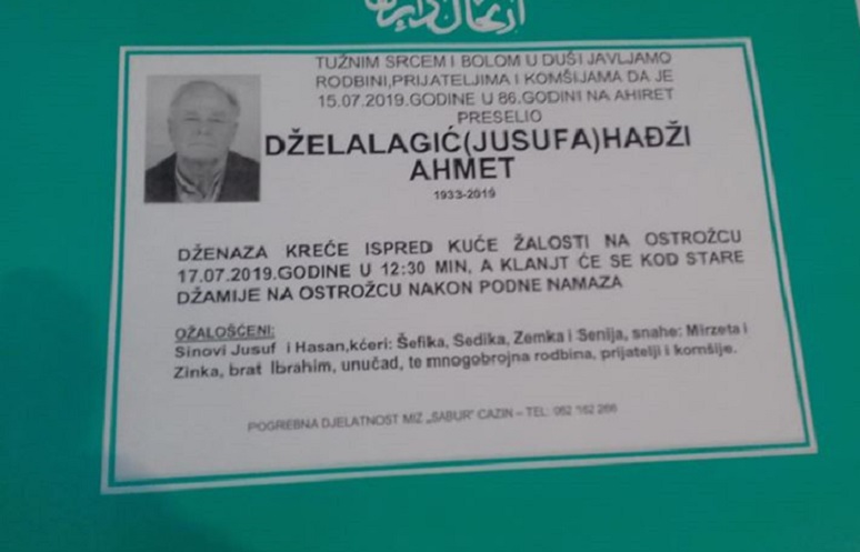 Tužnim srcem i bolom u duši javljamo rodbini, prijateljima i komšijama da je dana 15.07.2019. godine u 89. godini života na Ahiret preselio Dželalagić (Jusufa) hadži Ahmet.