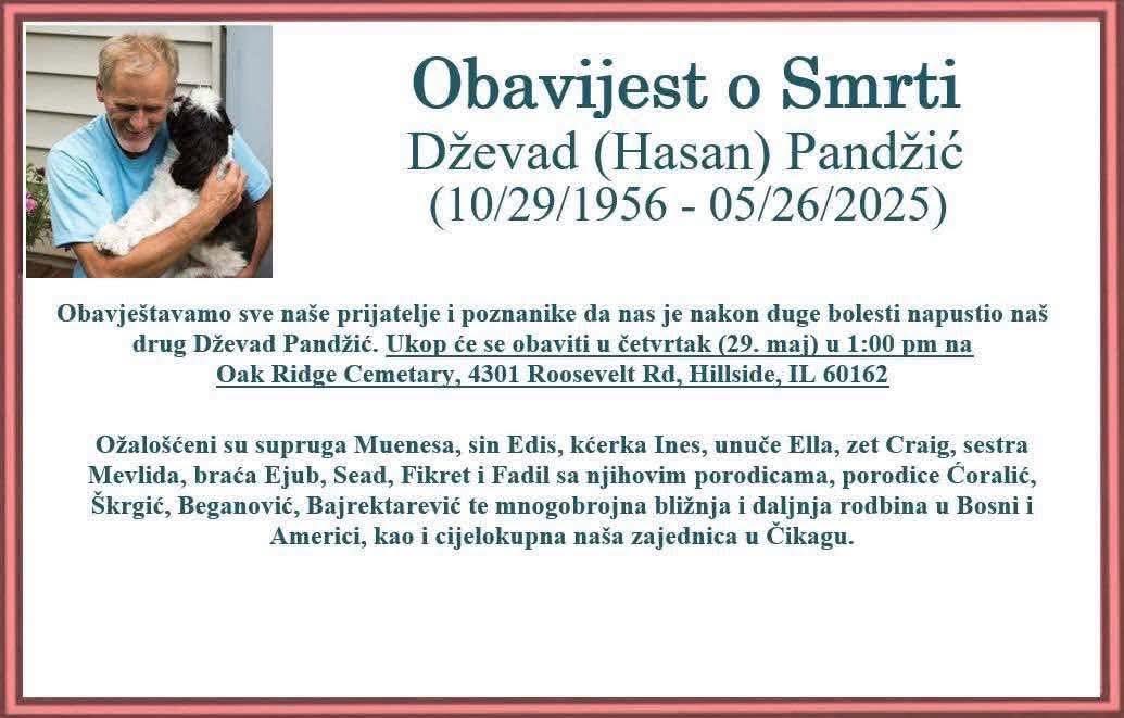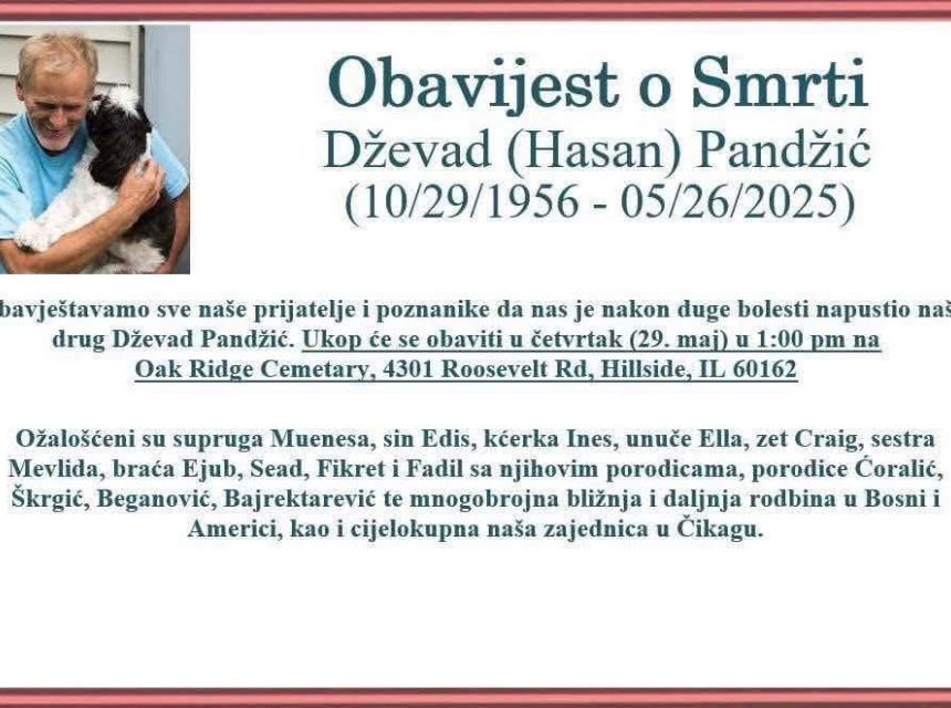 Obavještavamo sve naše prijatelje i poznanike da nas je nakon duge bolesti napustio naš drug Dževad Pandžić. Ukop će se obaviti u četvrtak (29. maj) u 1:00 pm na Oak Ridge Cemetary, 4301 Roosevelt Rd, Hillside, IL 60162