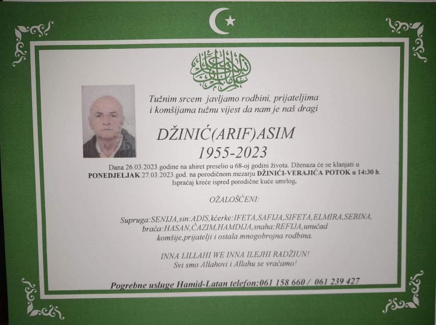 Dženaza će se klanjati u ponedjeljak 27.03.2023.godine na porodičnomo mezarju Džinići-Verajića Potok u 14:30h. Ispraćaj kreće ispred porodične kuće umrlog.
