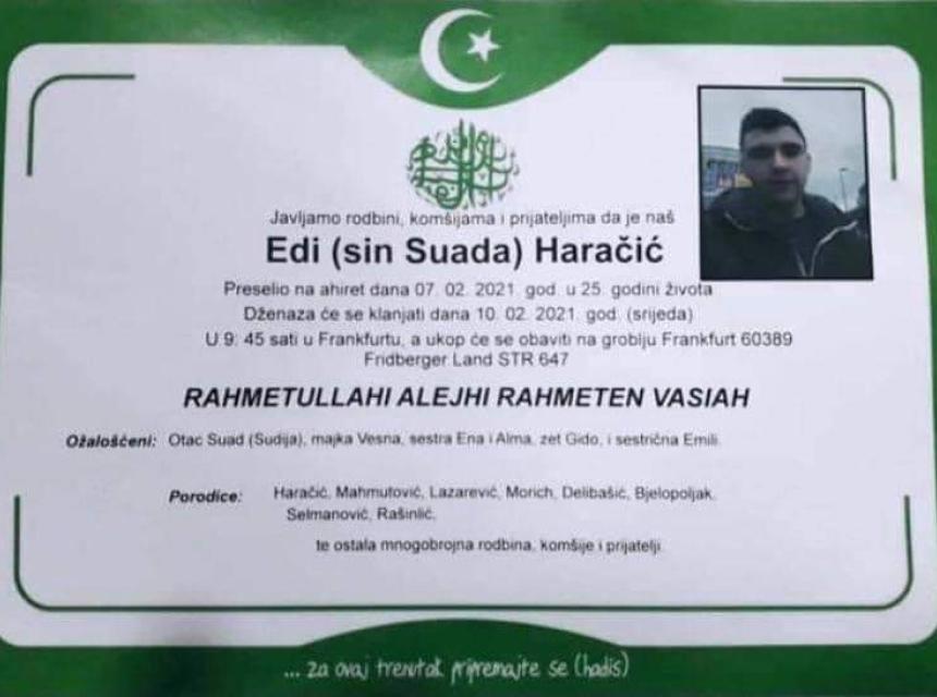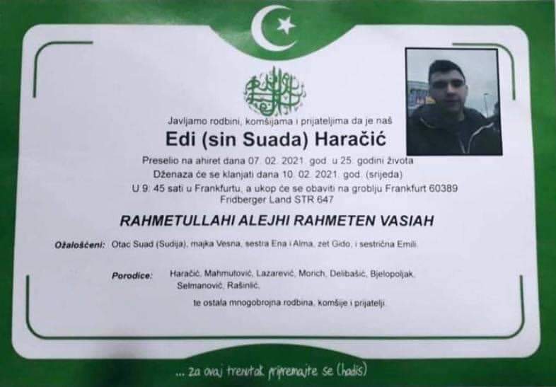 Tužnog srca i s bolom u duši obavještavamo rodbinu, komšije i prijatelje da je naš dragi Edi (sin Suada) Haračić 07.02.2021. godine, u 25. godini života preselio na Ahiret.
