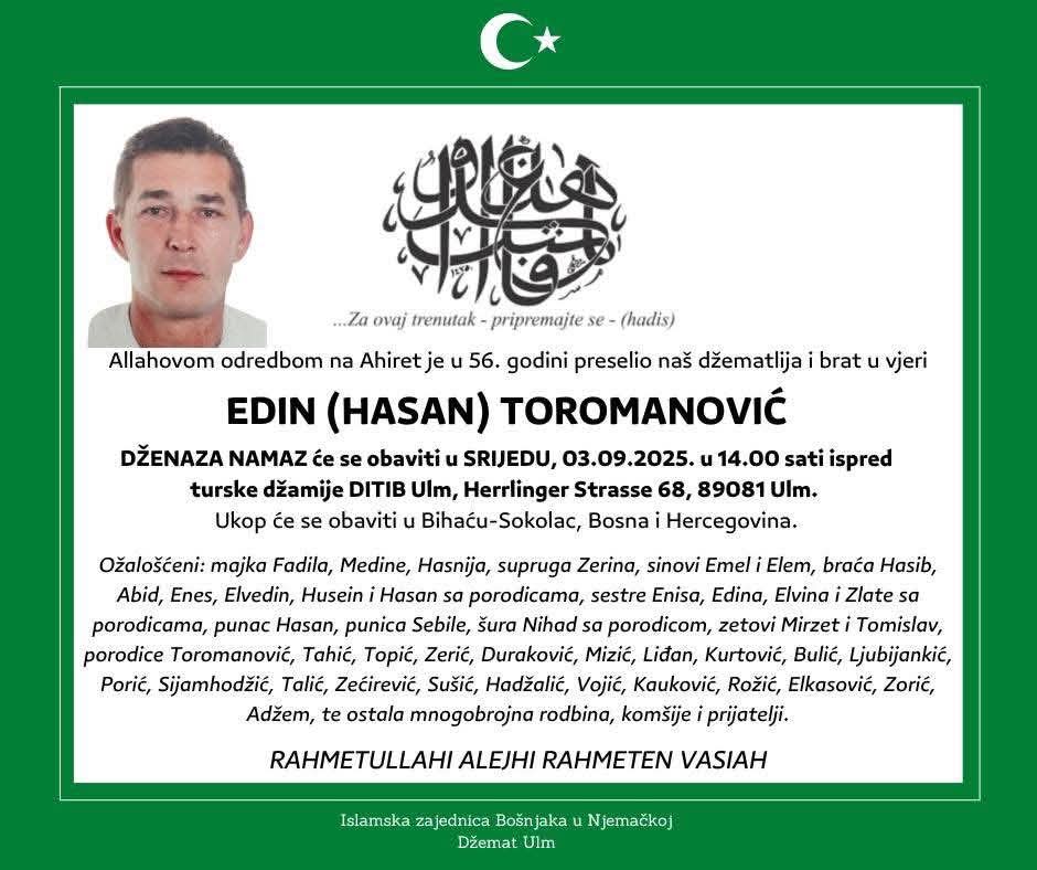 DŽENAZA NAMAZ će se obaviti u SRIJEDU, 03.09.2025. u 14.00 sati ispred turske džamije DITIB Ulm, Herrlinger Strasse 68, 89081 Ulm.