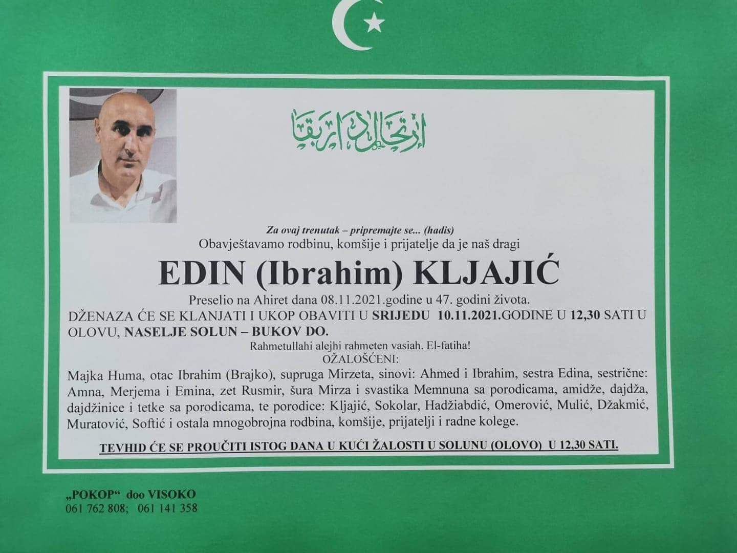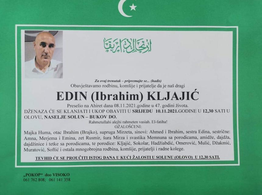 Tužnog srca i s bolom u duši obavještavamo rodbinu, komšije i prijatelje da je naš dragi Edin (Ibrahim) Kljajić dana 8.11.2021. u 47. godini života preselio na ahiret.