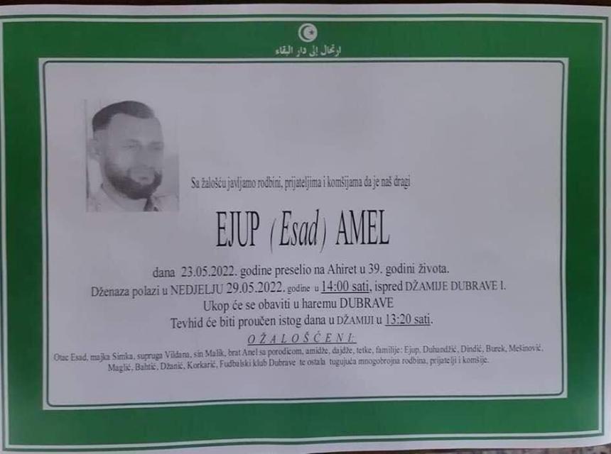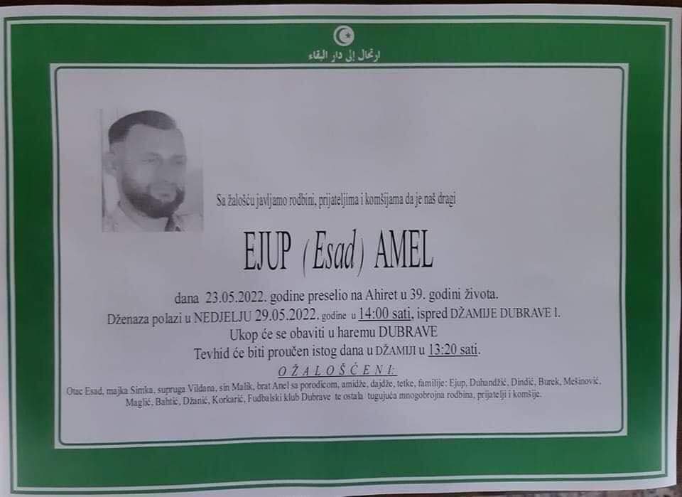 Tužnog srca i s bolom u duši obavještavamo rodbinu, komšije i prijatelje da je naš dragi Ejup (Esad) Amel u 39. godini života preselio na Ahiret.