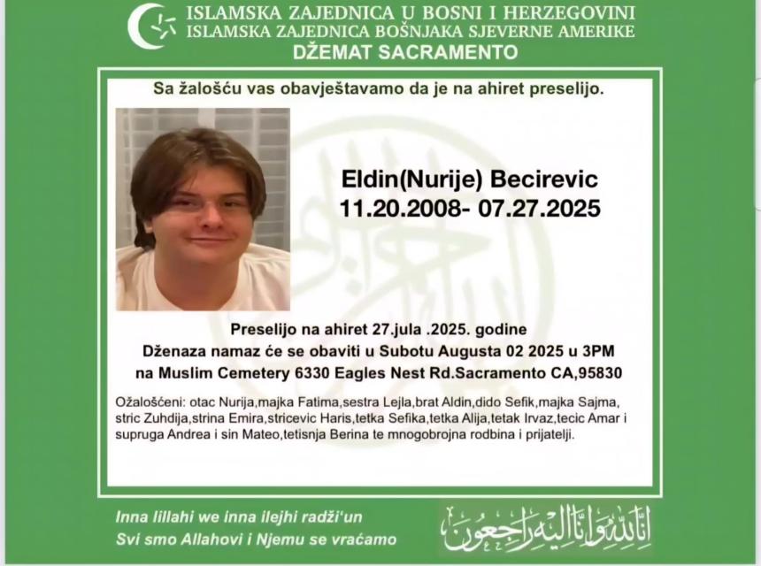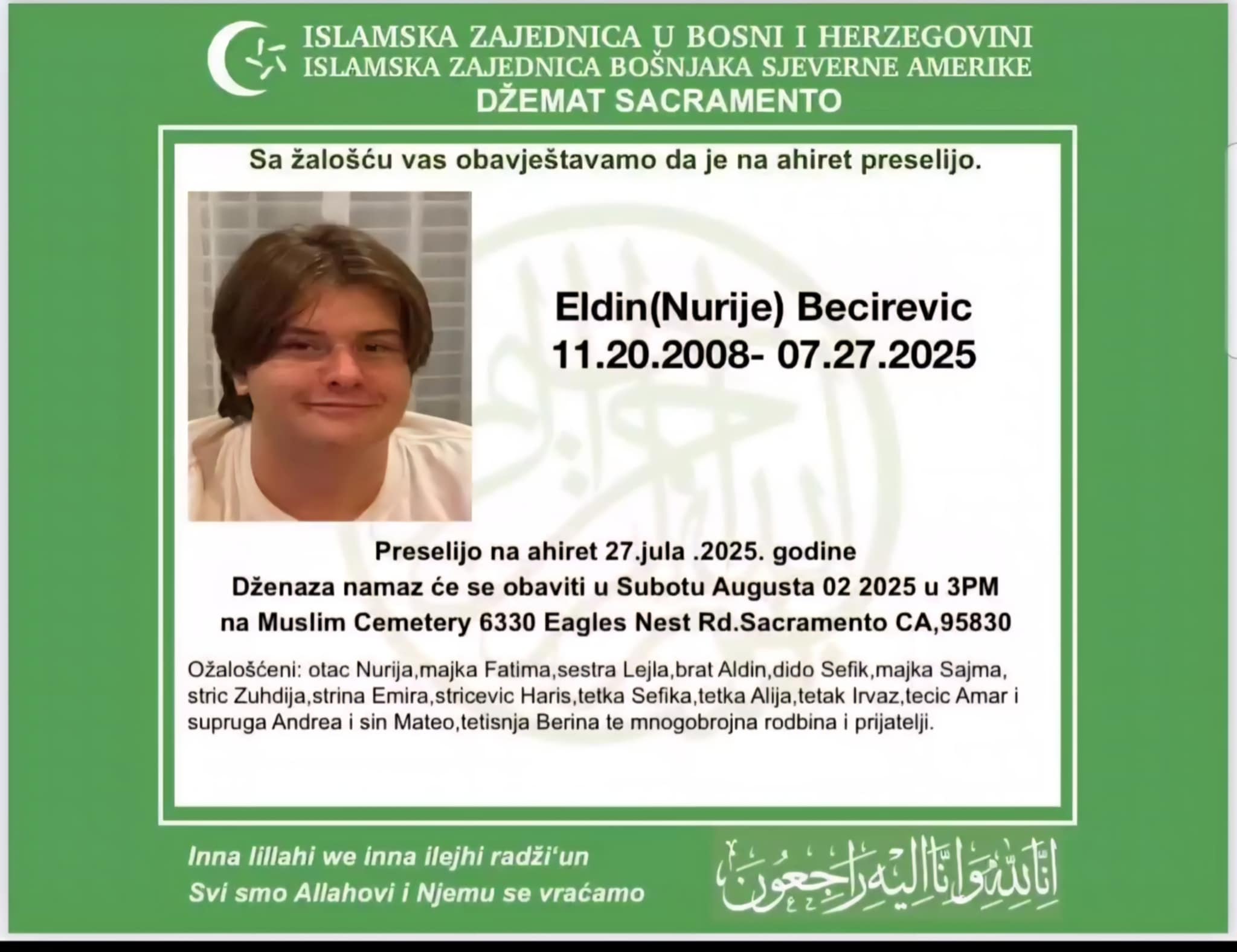 Dženaza namaz će se obaviti u Subotu Augusta 02 2025 u 3PM na Muslim Cemetery 6330 Eagles Nest Rd. Sacramento CA, 95830