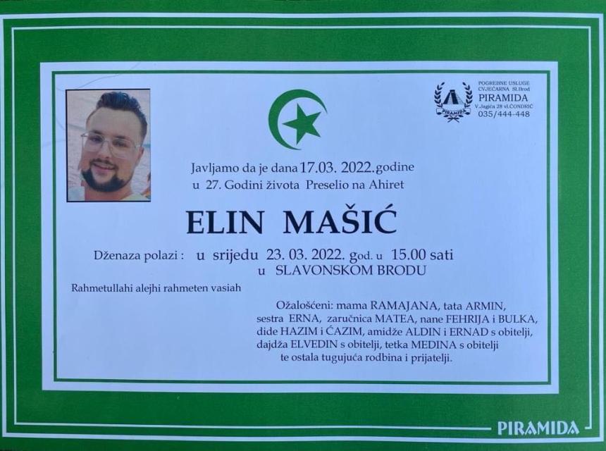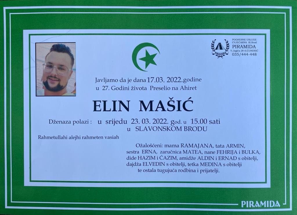 Tužnog srca i s bolom u duši obavještavamo rodbinu, komšije i prijatelje da je naš dragi Elin Mašić, dana 17.03.2022. godine, u 27-oj godini života, preselio na Ahiret.
