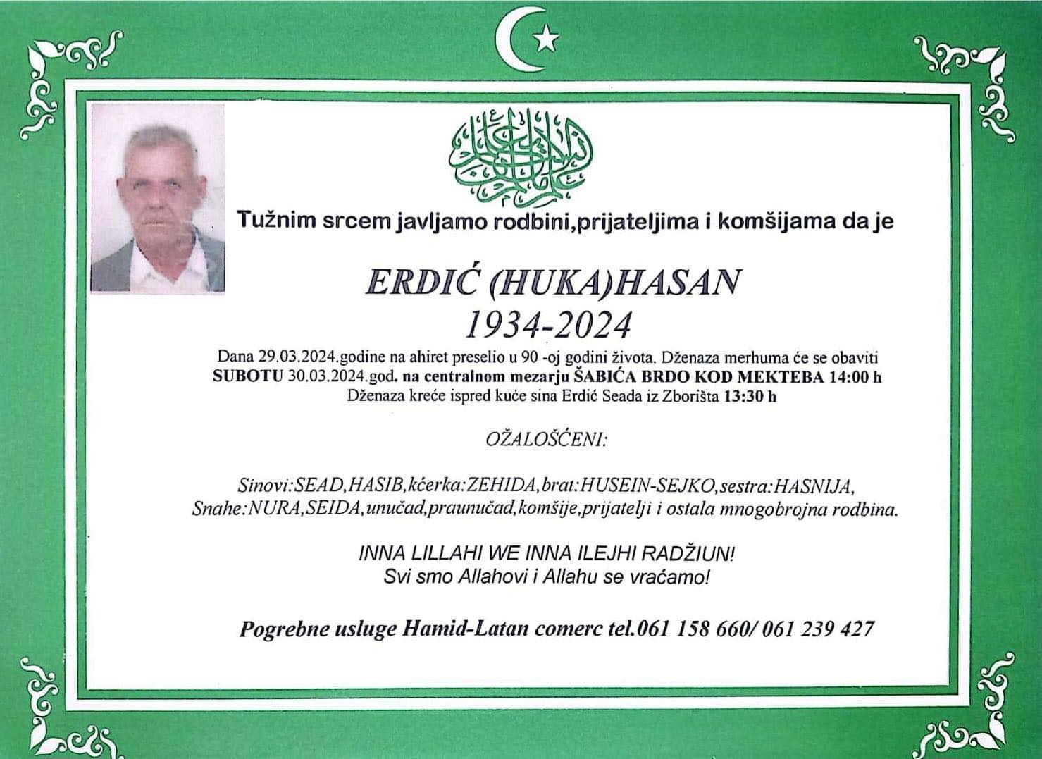 Dženaza merhuma će se obaviti u SUBOTU 30.03.2024. godine na CENTRALNOM MEZARJU ŠABIĆA BRDO KOD MEKTEBA u 14:00h. Dženaza kreće ispred kuće sina Erdić Seada iz Zborišta u 13:00h.