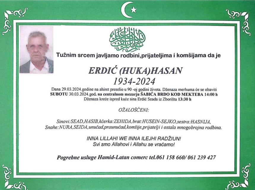 Tužnim srcem javljamo rodbini, prijateljima i komšijama žalosnu vijest da nam je naš dragi Erdić (Huka) Hasan dana 29. 03. 2024. godine u 90. godini života preselio na Ahiret.