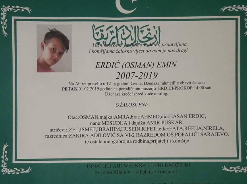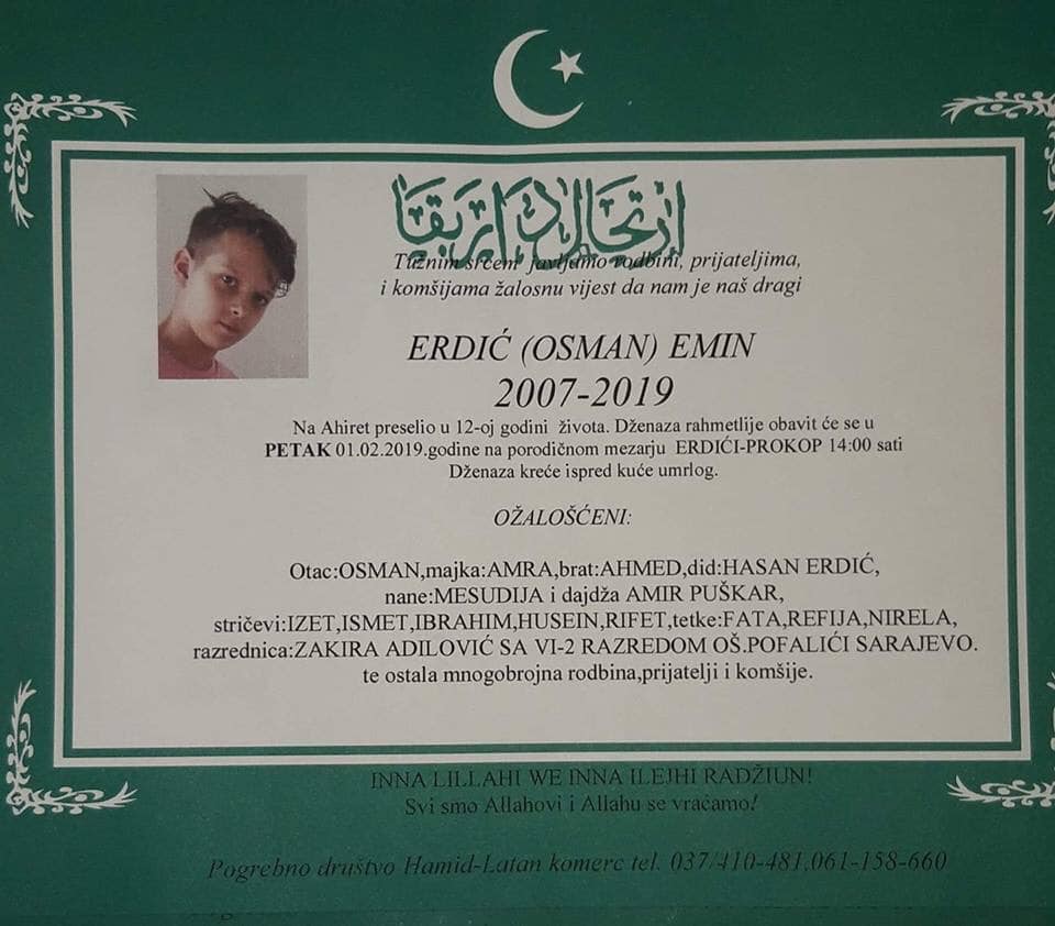 Tužnim srcem i bolom u duši javljamo rodbini, komšijama i prijateljima da je u 12 godini života na Ahiret preselio Erdić (Osmana) Emin.