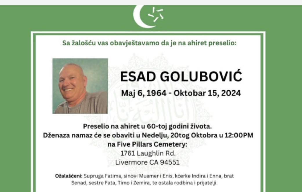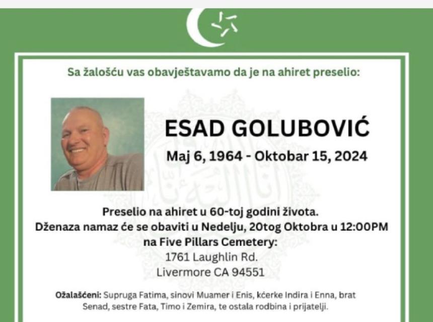 Obavještavamo rodbinu, komšije i prijatelje da je dana 15.10.2024 godine u 60-oj godini života na ahiret preselio Esad Golubović.