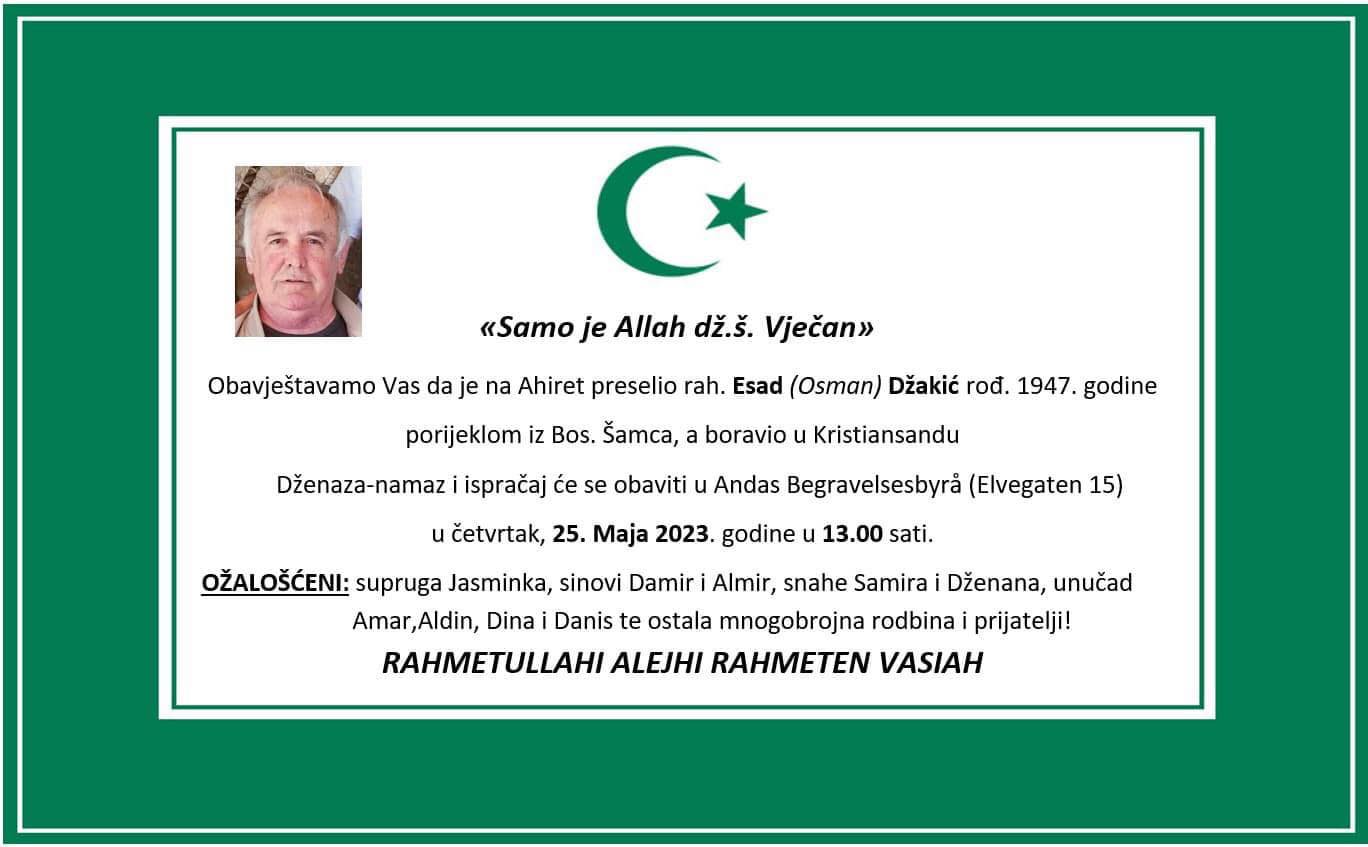 Tužnim srcem javljamo rodbini, prijateljima i poznanicma da nam je naš dragi Esad (Osman) Džakić rođen 1947. godine preselio na Ahiret.