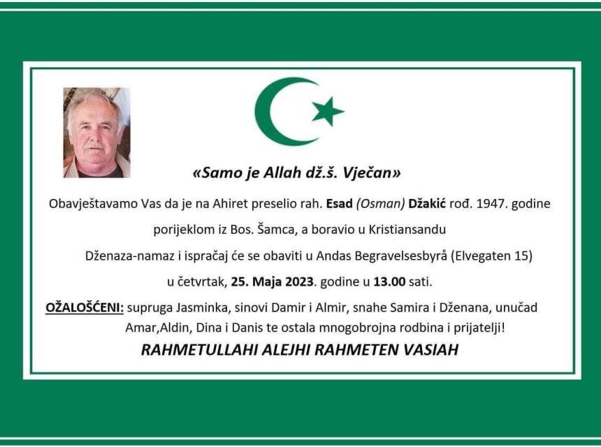 Dženaza namaz i ispraćaj će se obaviti Andas Begravelsesbyra u četvrtak 25. maja 2023. godine u 13 sati.