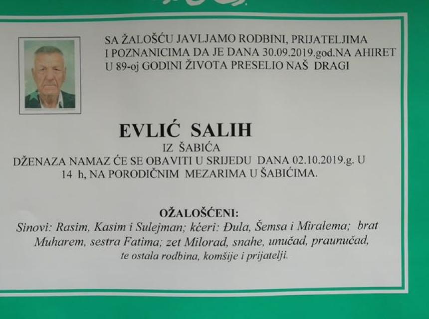Sa žalošću javljamo rodbini, prijateljima i poznanicima da je dana 30.09.2019. god. na Ahiret u 89-oj godini života preselio naš dragi Evlić Salih.