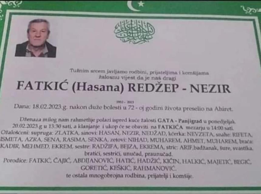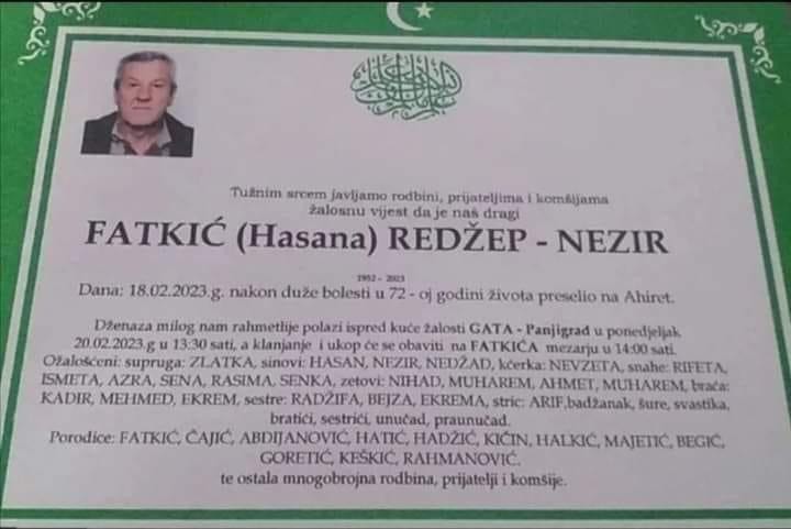 Tužnim srcem i bolom u duši obavještavamo rodbinu, prijatelje i komšije da je naš dragi Fatkić (Hasana) Redžep - Nezir, dana 18.02.2023. godine u 72-oj godini života, preselio na Ahiret.