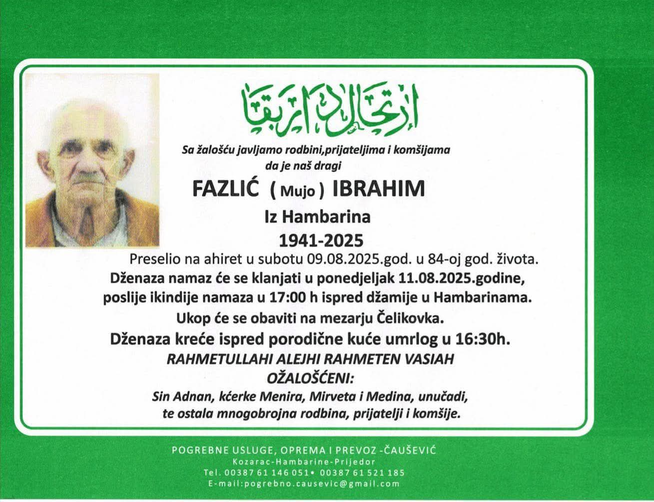 Dženaza namaz će se klanjati u ponedjeljak 11.08.2025. godine, poslije ikindije namaza u 17:00 h ispred džamije u Hambarinama.