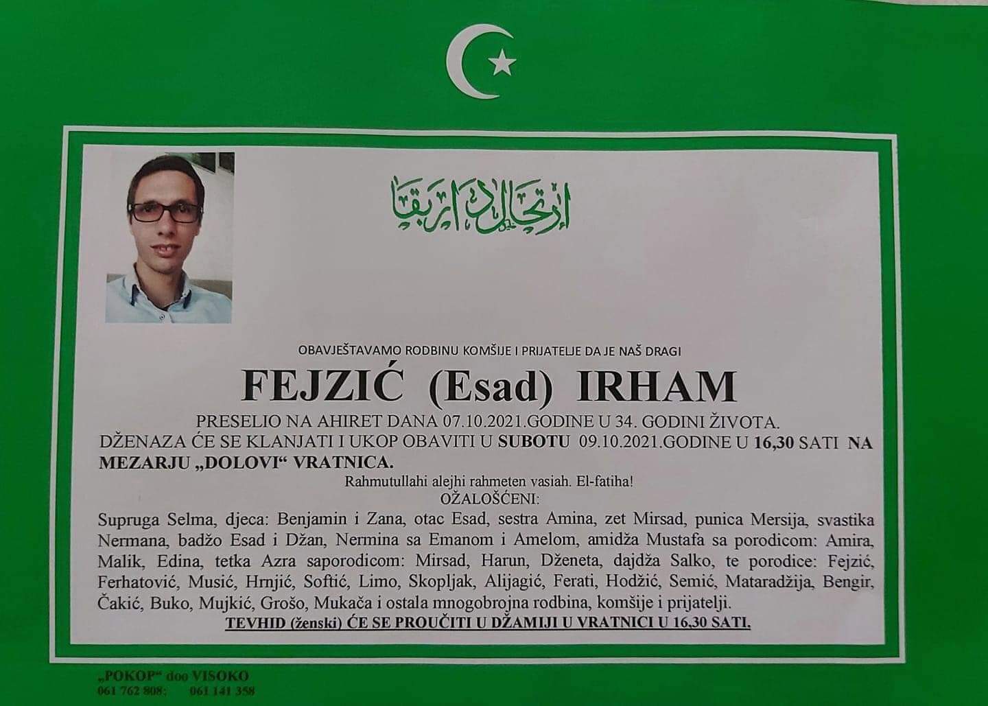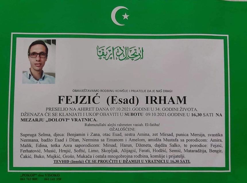 Tužnog srca i s bolom u duši obavještavamo rodbinu, komšije i prijatelje da je naš dragi Fejzić (Esad) Irham, dana 07.10.2021. godine, u 34-oj godini života preselio na ahiret.
