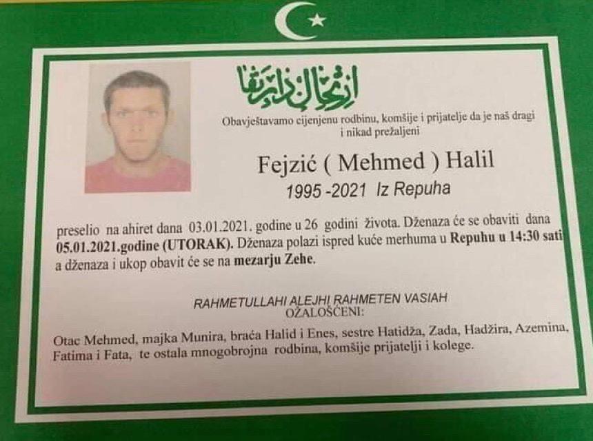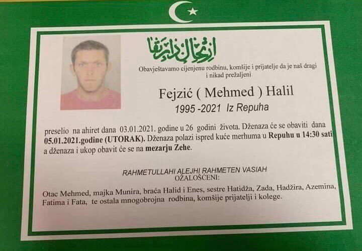Tužnog srca i s bolom uduši obavještavamo rodbinu, komšije i prijatelje da je naš dragi Fejzić (Mehmed) Halil preselio na Ahiret, dana 3. januara 2021. godine u 26. godini života.