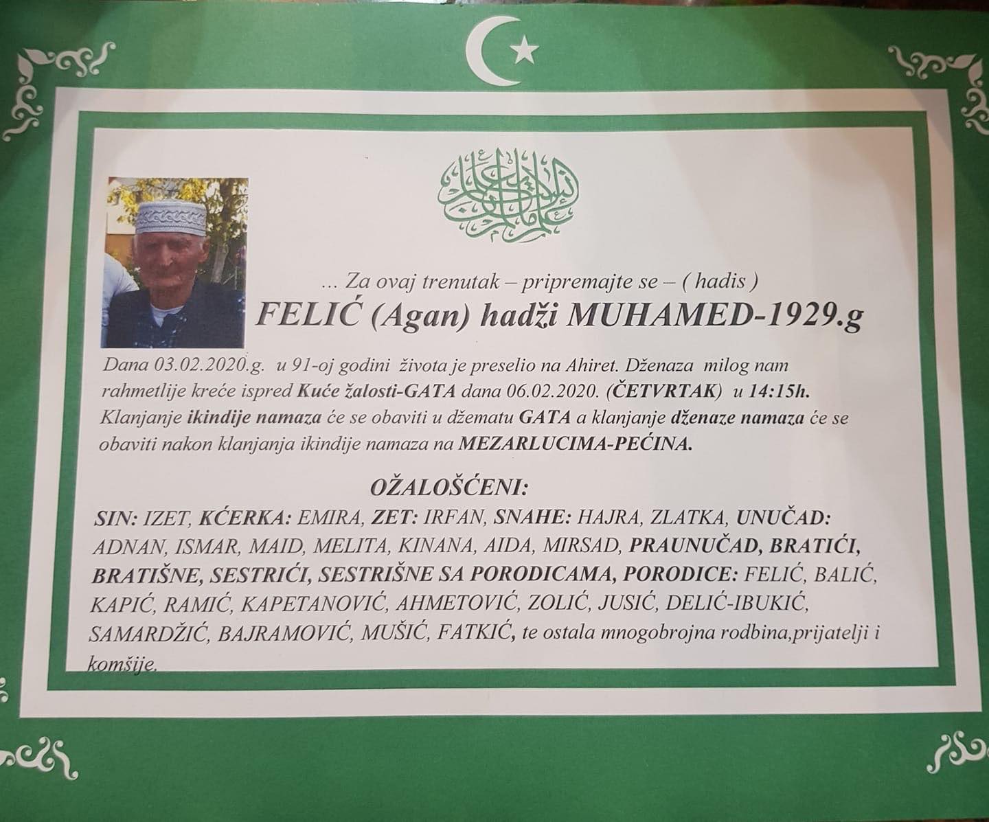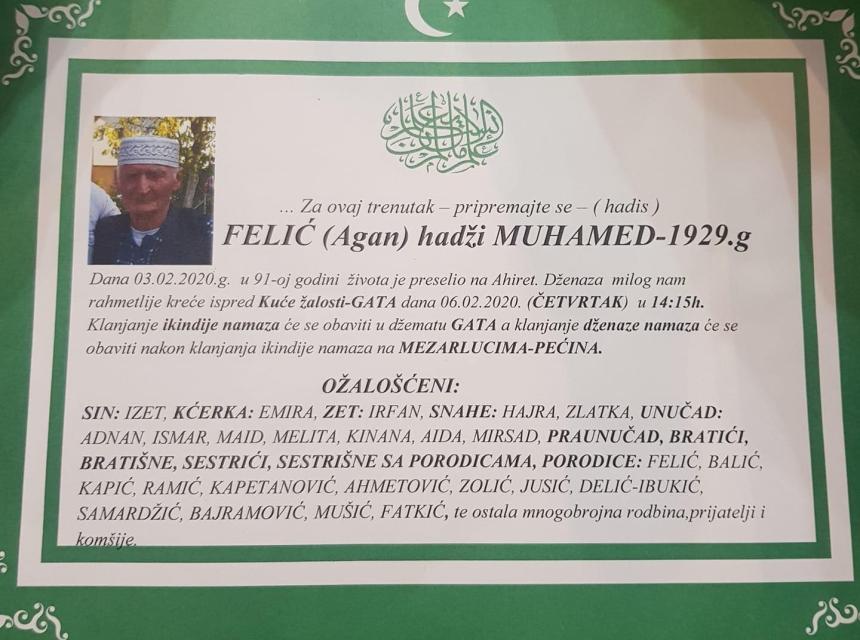 Tužnim srcem i s bolom u duši obavještavamo rodbinu, prijatelje i komšije da je naš dragi Felić (Agan) Hadži Muhamed preselio na Ahiret 03.02.2020. godine u 91. godini života.