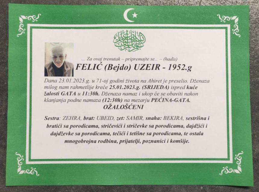 Dana 230.01.2023. g. u 71-oj godini života na Ahiret je preselio Felić (Bejdo) Uzeir.