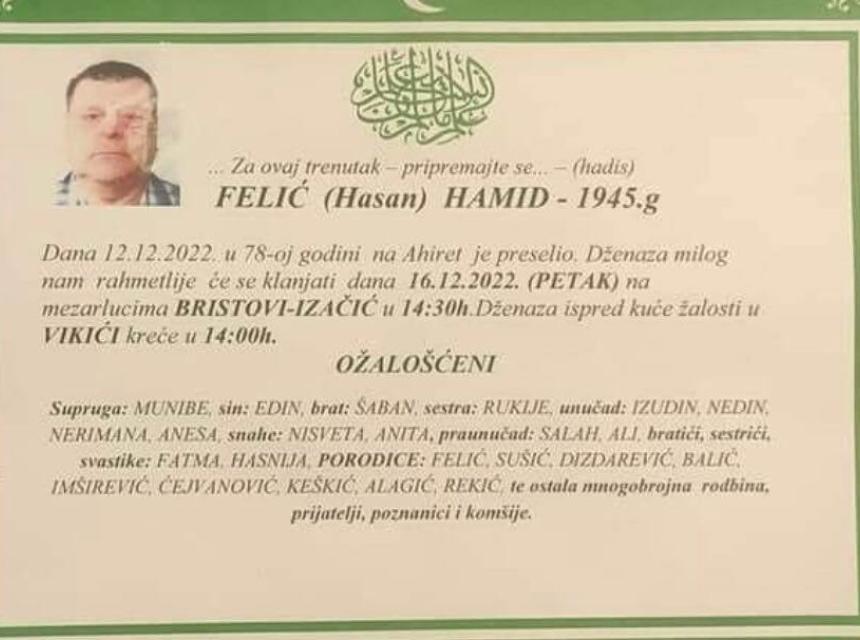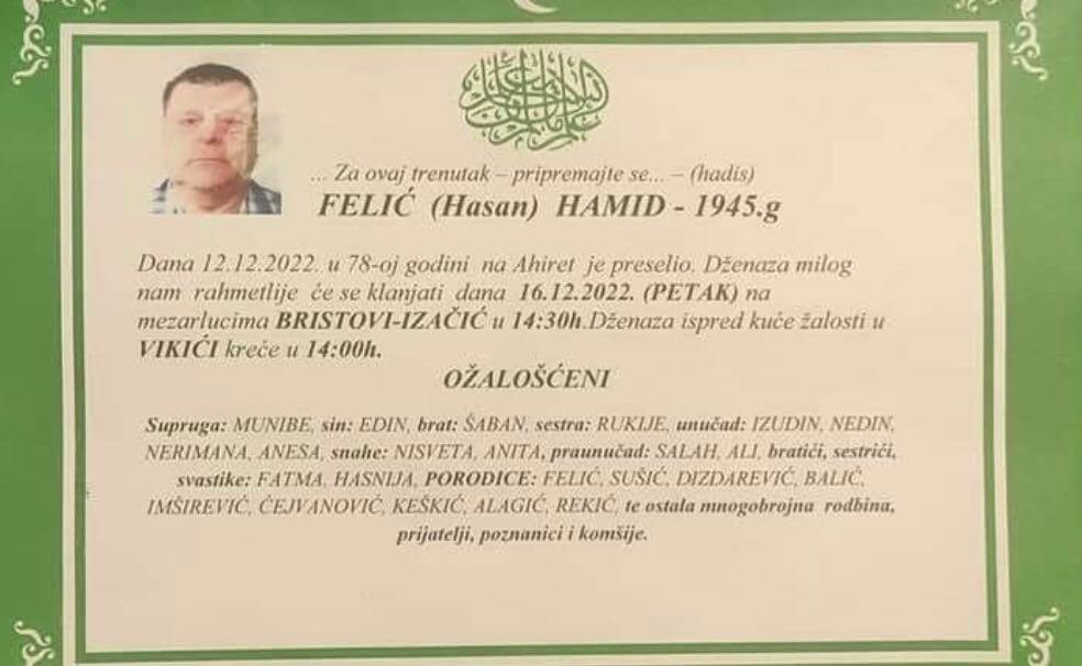 Tužnog srca i s bolom u duši obavještavamo rodbinu, komšije i prijatelje da je naš dragi Felić (Hasan) Hamid u 78. godini života preselio na Ahiret.
