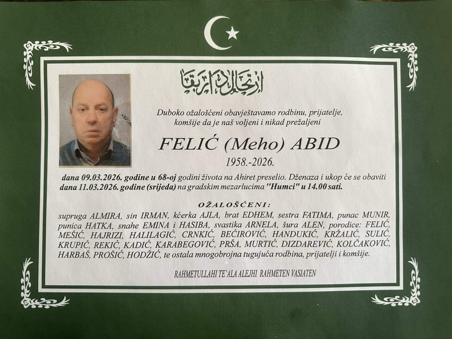 Dženaza i ukop će se obaviti dana 11.03.2026. godine (srijeda) na gradskim mezarlucima “Humci” u 14.00 sati.