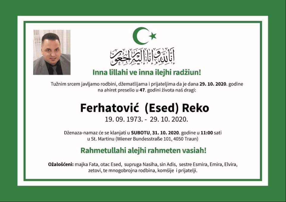 Dženaza namaz će se klanjati u subotu, 31.10.2020. u 11:00 sati u St. Martinu (Wiener Bundesstraße 101, 4050 Traun).