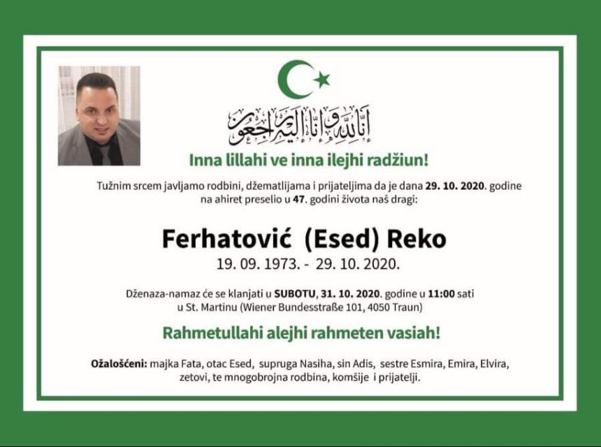 Tužnog srca i s bolom u duši obavještavamo rodbinu, komšije i prijatelje da je naš dragi Ferhatović (Esed) Reko preselio na Ahiret, dana 29. oktobra 2020. godine u 47. godini života.