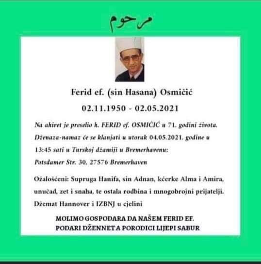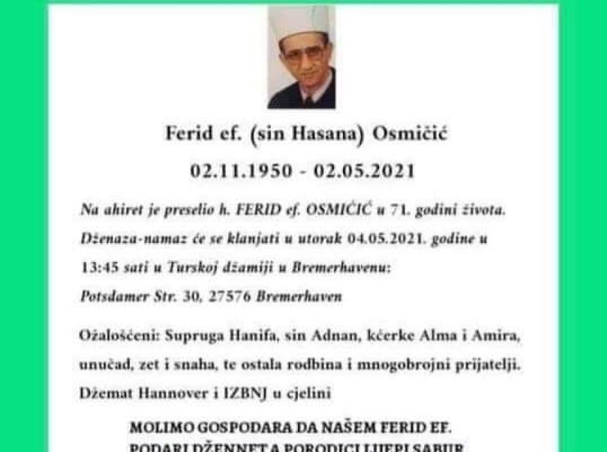 Na ahiret je, u 71. godini preselio Ferid ef. (sin Hasana) Osmičić koji je zadnjih godina boravio i radio u Njemačkoj.