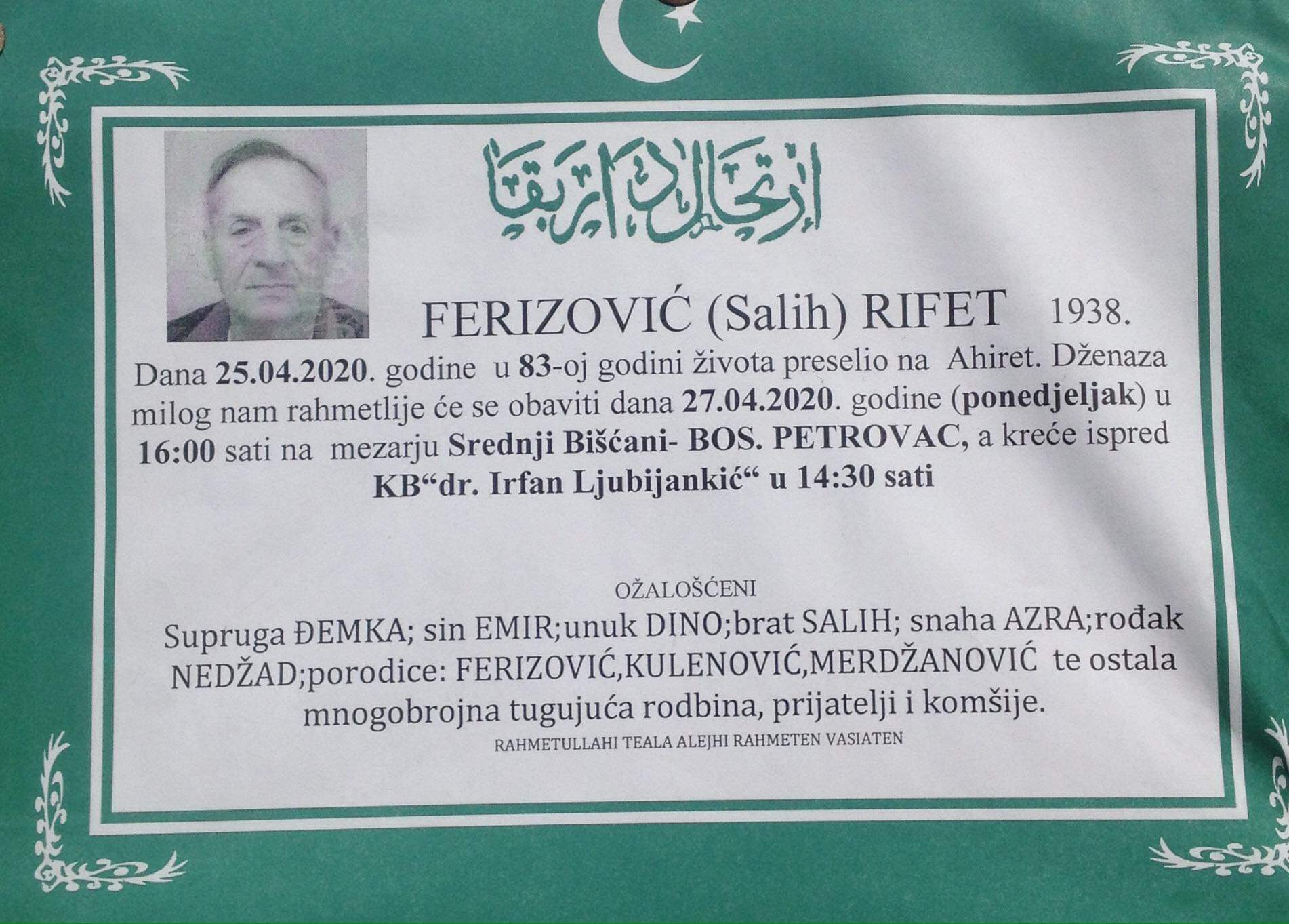 Teškim srcem i bolom u duši javljamo da je naš dragi i nikad prežaljeni Ferizović (Salih) Rifet dana 25.04.2020.godine u 83-oj godini života preselio na Ahiret.