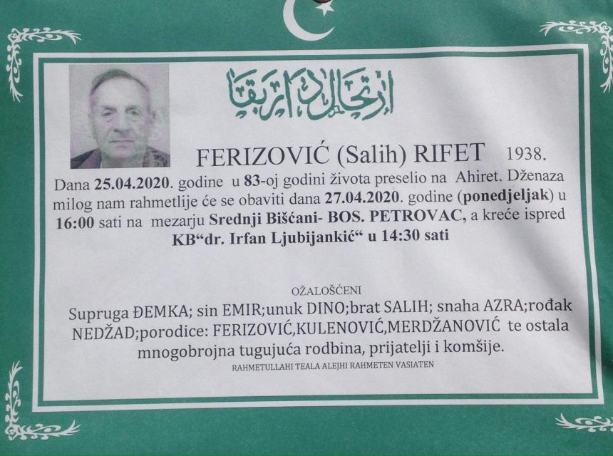 Dženaza namaz polazi ponedjeljak 27.04.2020.godine u 16 sati na mezarju Srednji Bišćani - Bosanski Petrovac, a kreće ispred KB. Dr. Irfana Ljubijankića u 14:30.