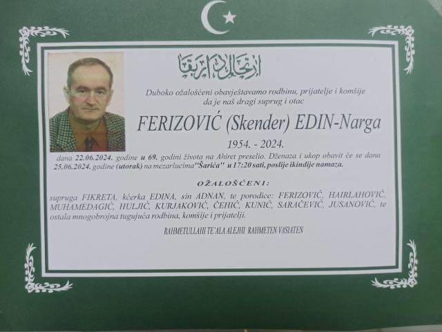 Tužnim srcem i bolom u duši javljamo rodbini, prijateljima i komšijama da je naš dragi Ferizović (Skender) Edin - Narga, dana 22.06.2024. godine u 69-oj godini života, preselio na Ahiret.