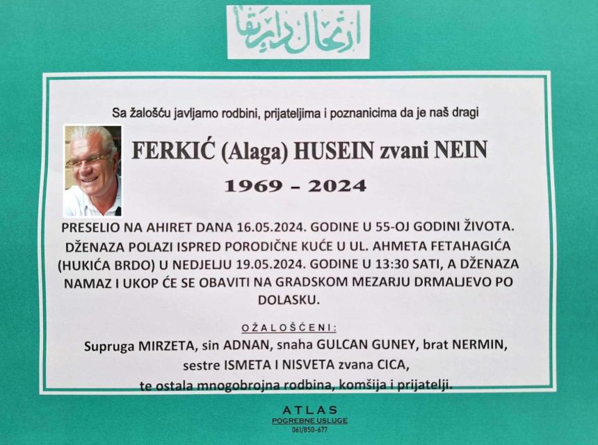 Dženaza namaz polazi ispred porodične kuće u ul. Ahmeta Fetahagića (HUKIĆA BRDO) u nedjelju 19.05.2024. godine u 13:30 sati, a dženaza namaz i ukop će se obaviti na gradskom mezarju Drmaljevo po dolasku.