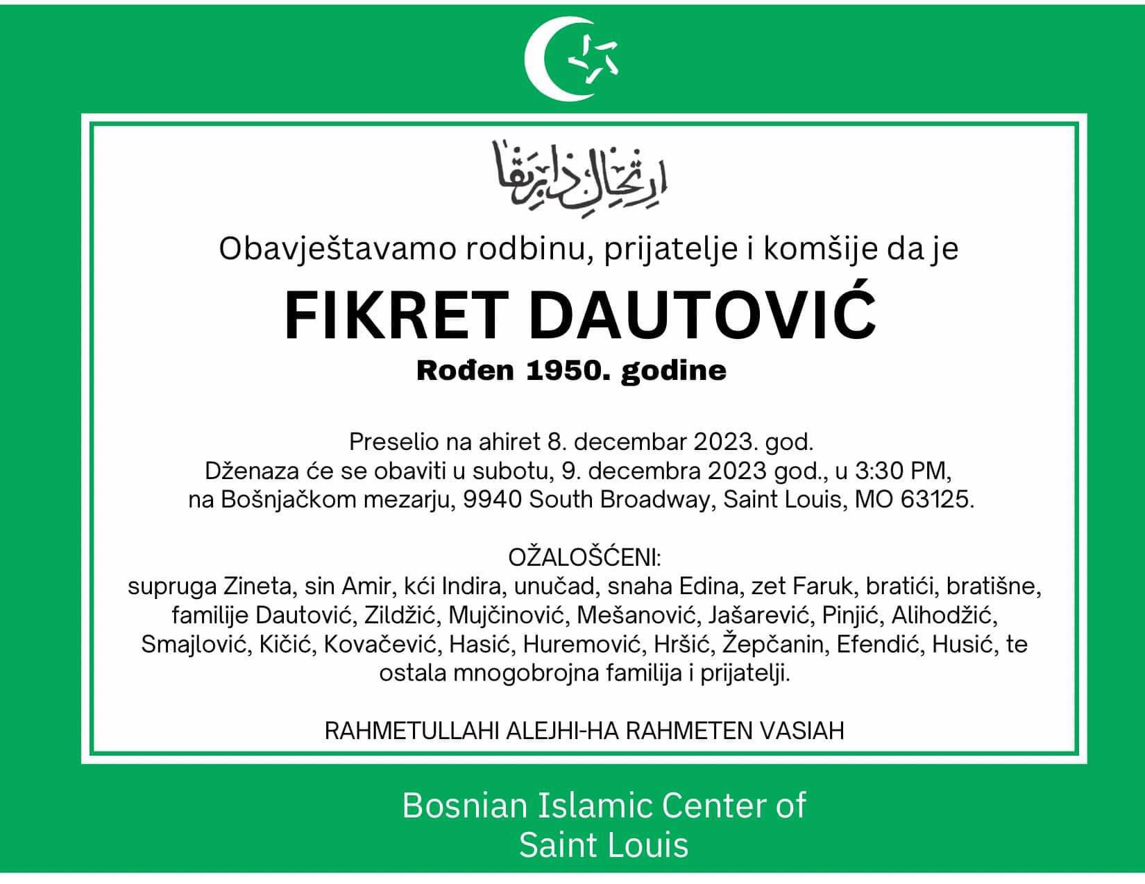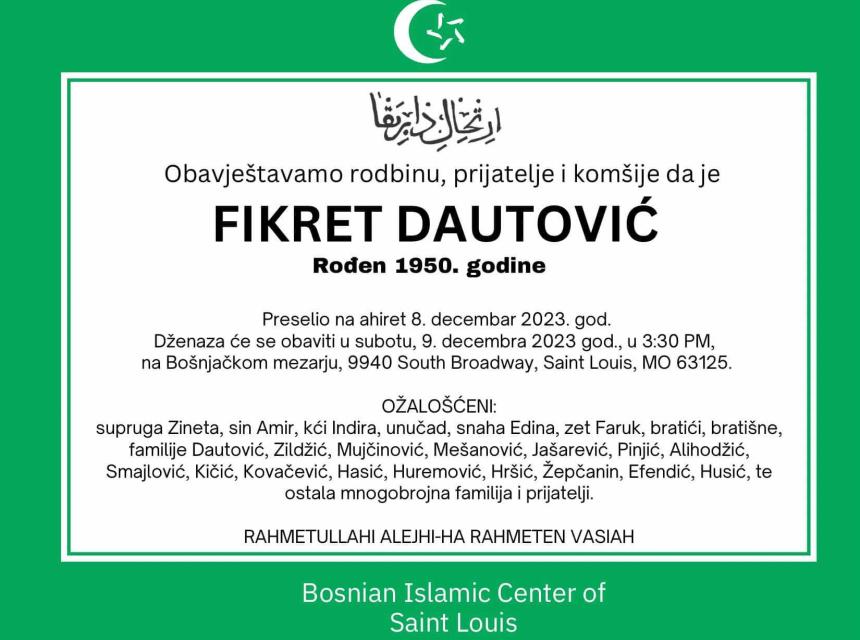 Dženaza će se obaviti u subotu, 9.12.2023. u 3:30PM, na Bošnjačkom mezarju, 9940 South Broadway, Saint Louis, MO 63125