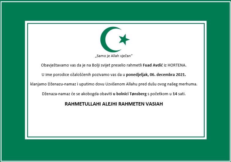 Tužnog srca i s bolom u duši obavještavamo rodbinu, komšije i prijatelje da je naš dragi Fuad Avdić preselio na Ahiret.
