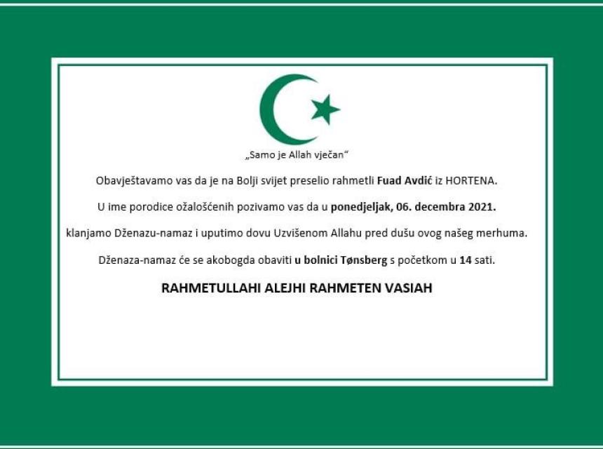 Dženaza namaz će se obaviti u bolnici Tønsberg s početkom u 14 sati.