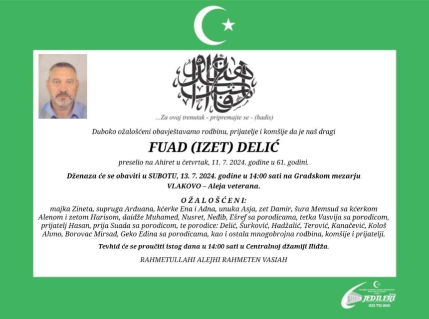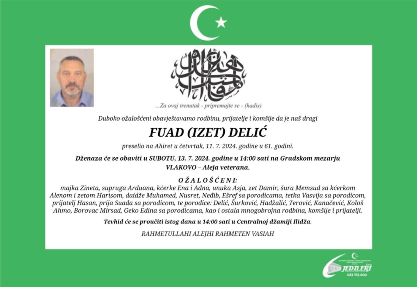 Tužnim srcem i bolom u duši javljamo rodbini, prijateljima i komšijama da je naš dragi Fuad (Izet) Delić, dana 11.07.2024. godine u 61-oj godini života, preselio na Ahiret.