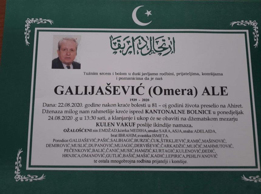 Tužnog srca i s bolom u duši obavještavamo rodbinu, komšije i prijatelje da je naš dragi Galijašević (Omera) Ale, dana 22.08.2020. godine, u 81-oj. godini života, preselio na Ahiret.
