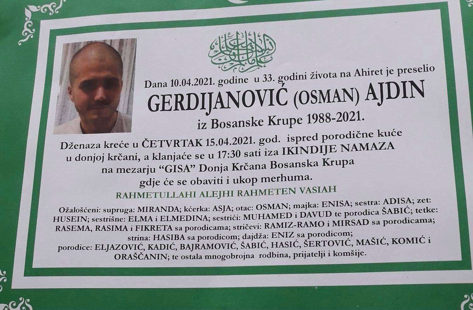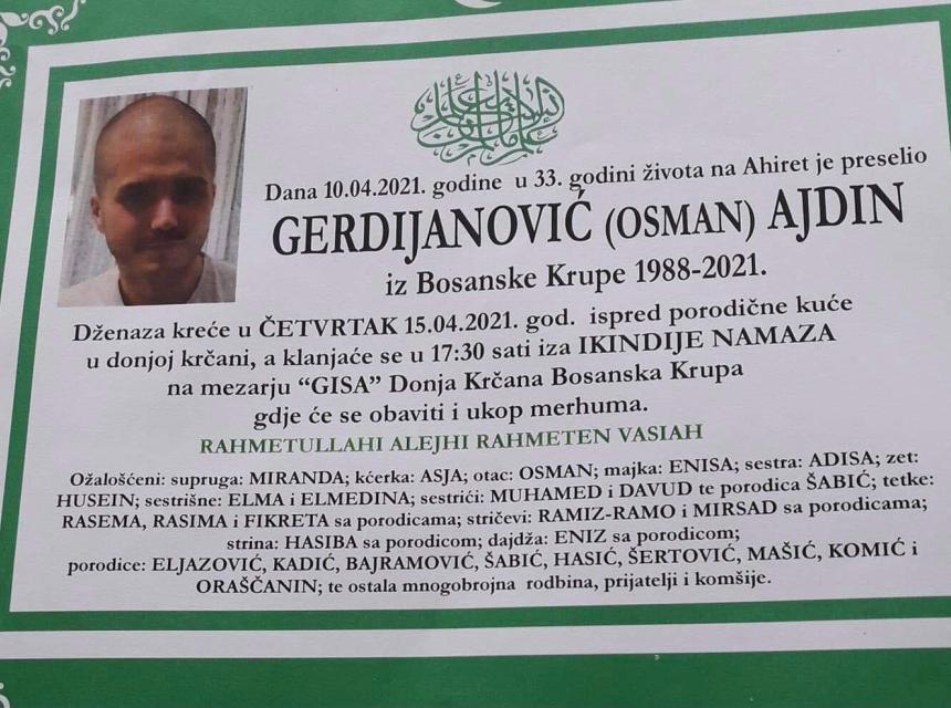 Tužnog srca i s bolom u duši obavještavamo rodbinu, komšije i prijatelje da je naš dragi Gerdijanović (Osman) Ajdin, 10.04.2021. godine, u 33. godini života preselio na Ahiret.