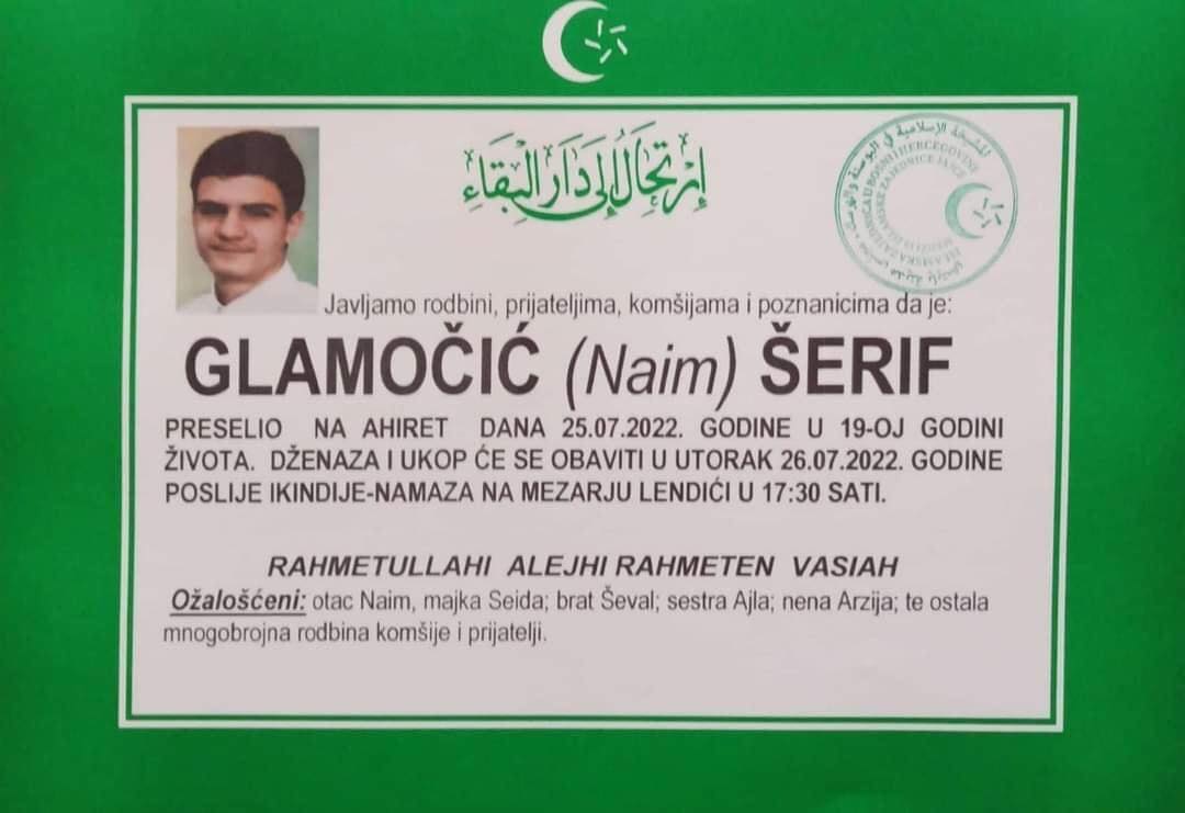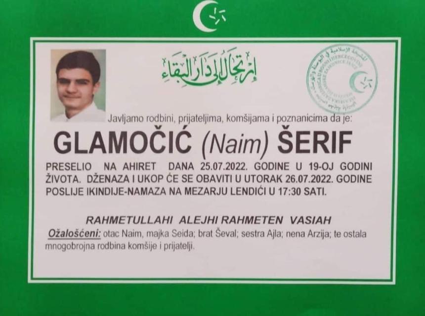 Dženaza polazi ispred kuće umrlog u utorak dana 26.07.2022.god, a klanjanje i ukop će se obaviti na mezarju Lendići nakon ikindije namaza.