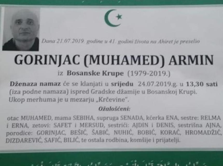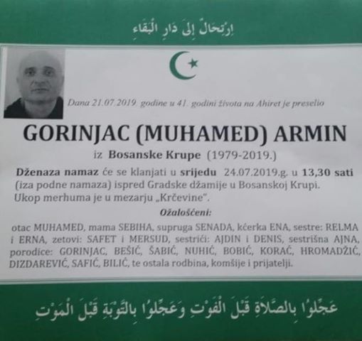 Tužnim srcem i bolom u duši javljamo rodbini, prijateljima, komšijama i poznanicima da je dana 21.07.2019. god. u 41-oj. godini života na Ahiret preselio naš dragi Gorinjac (Muhamed) Armin.