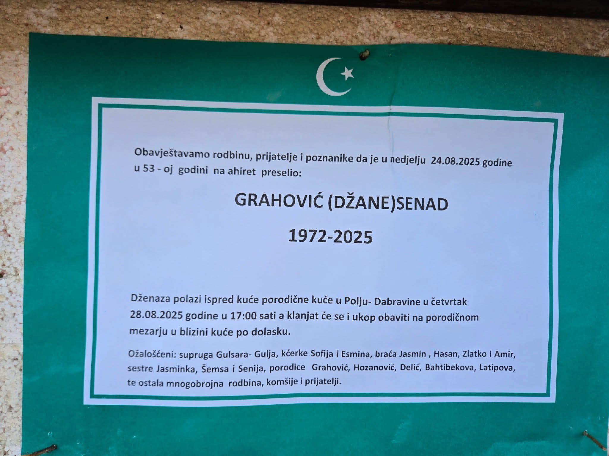Dženaza polazi ispred kuće porodične kuće u Polju – Dabravine u četvrtak 28.08.2025. godine u 17:00 sati, a klanjat će se i ukop obaviti na porodičnom mezarju u blizini kuće po dolasku