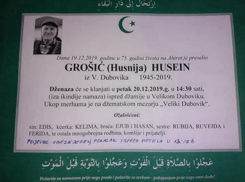 Tužnim srcem i bolom u duši javljamo rodbini i prijateljima da je dana 19.12.2019. godine u 75-oj godini života, na Ahiret preselio Grošić (Husnija) Husein.