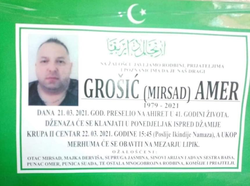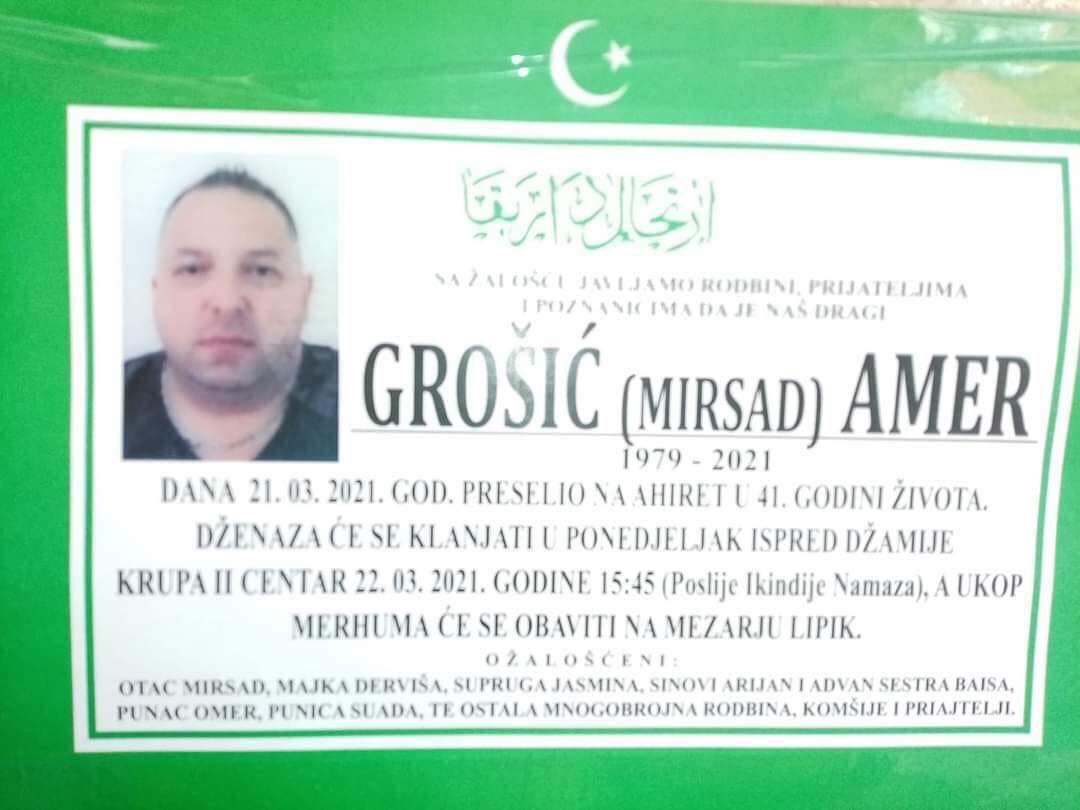Tužnog srca i s bolom u duši obavještavamo rodbinu, komšije i prijatelje da je naš dragi Grošić (Mirsad) Amer, 21.03.2021. godine, u 41. godini života preselio na Ahiret.