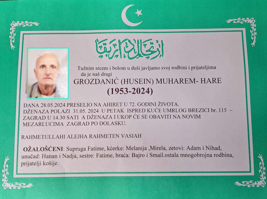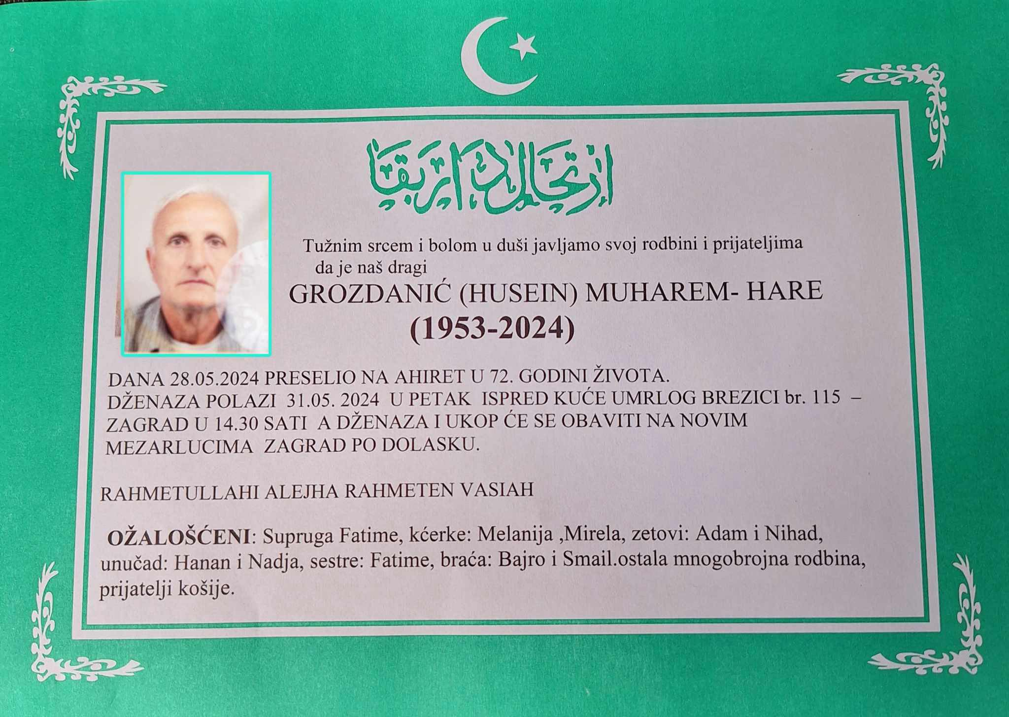 Tužnim srcem javljamo rodbini, prijateljima i komšijama da je Grozdanić (Husein) Muharem-Hare dana 28.05.2024. godine na ahiret preselio u 72-oj godini života.