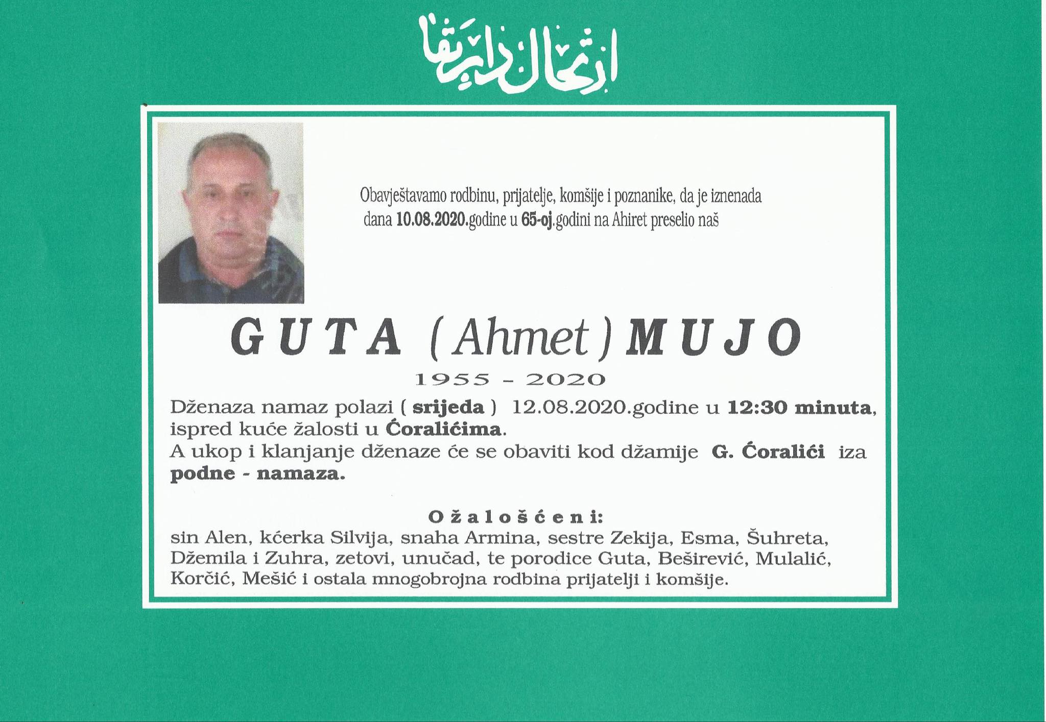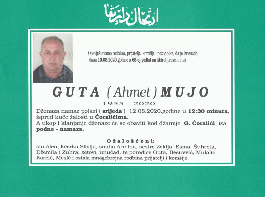 Tužnog srca i s bolom u duši obavještavamo rodbinu, komšije i prijatelje da je naš dragi Guta (Ahmet) Mujo dana 10.08.2020. godine, u 65-oj. godini života, preselio na Ahiret.