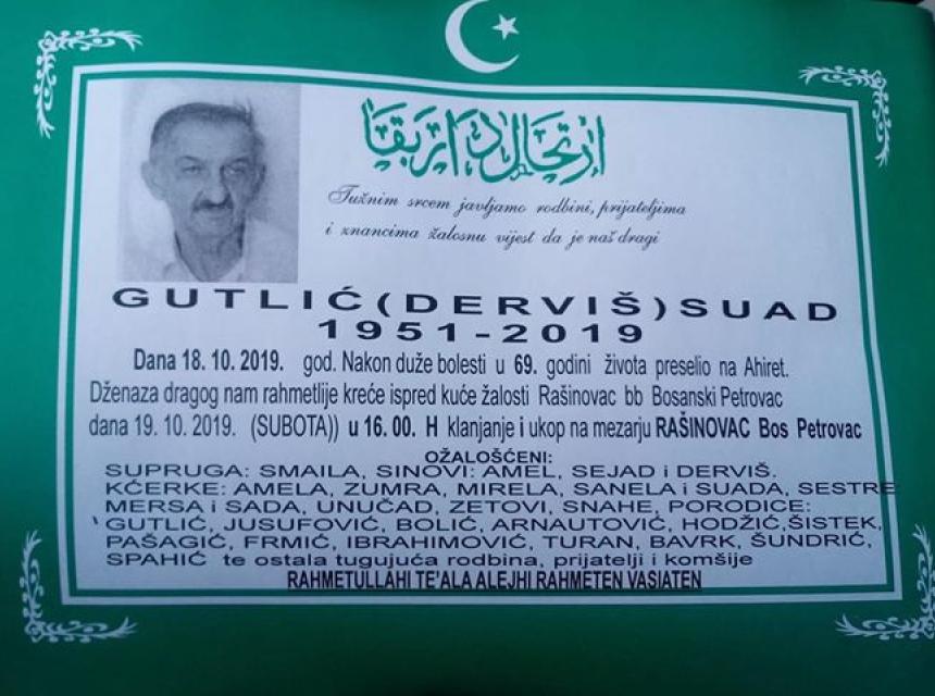 Tužnim srcem javljamo rodbini, prijateljima i poznanicima ružnu vijest da je naš dragi Gutlić (Derviš) Suad dana 18.10.2019. god. nakon duže bolesti u 69. godini života preselio na Ahiret.