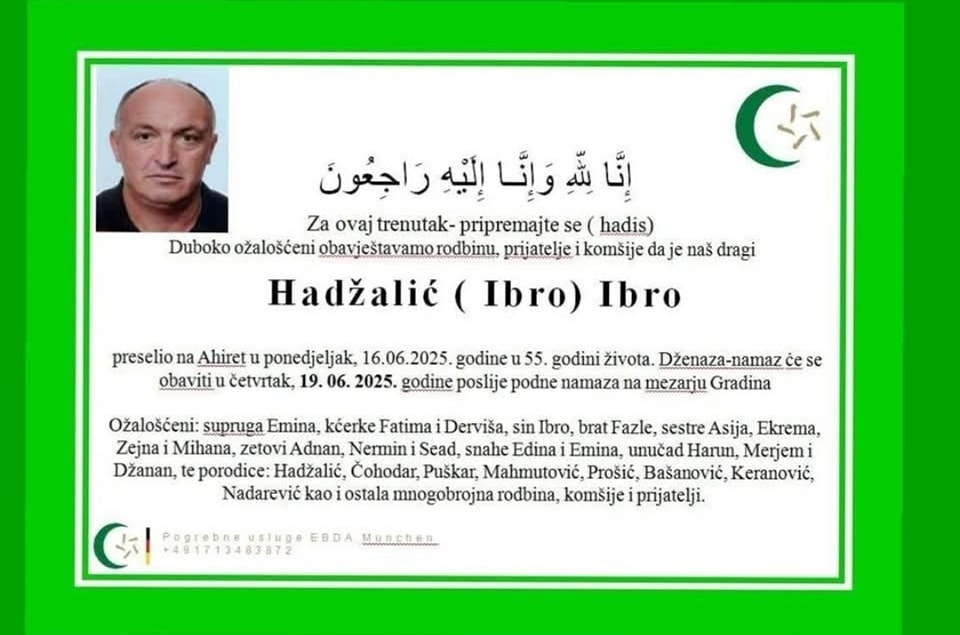 Dženaza pnamaz će se obaviti u četvrtak, 19.06.2025. godine poslije podne namaza na mezarju Gradina.